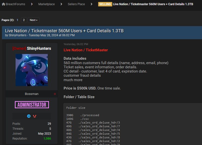Earlier this week, a cybercriminal group posted an alleged database up for sale online which, it says, contains customer and card details of 560 million Live Nation/Ticketmaster users.